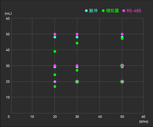 從表中數(shù)據(jù)可以看出,一旦改變了轉(zhuǎn)速和泵出量,不同的驅(qū)動(dòng)方式控制的蠕動(dòng)泵會(huì)有不同結(jié)果。3種驅(qū)動(dòng)方式中,RS-485通訊方式的控制精度最優(yōu),脈沖次之,模擬量的誤差最大。